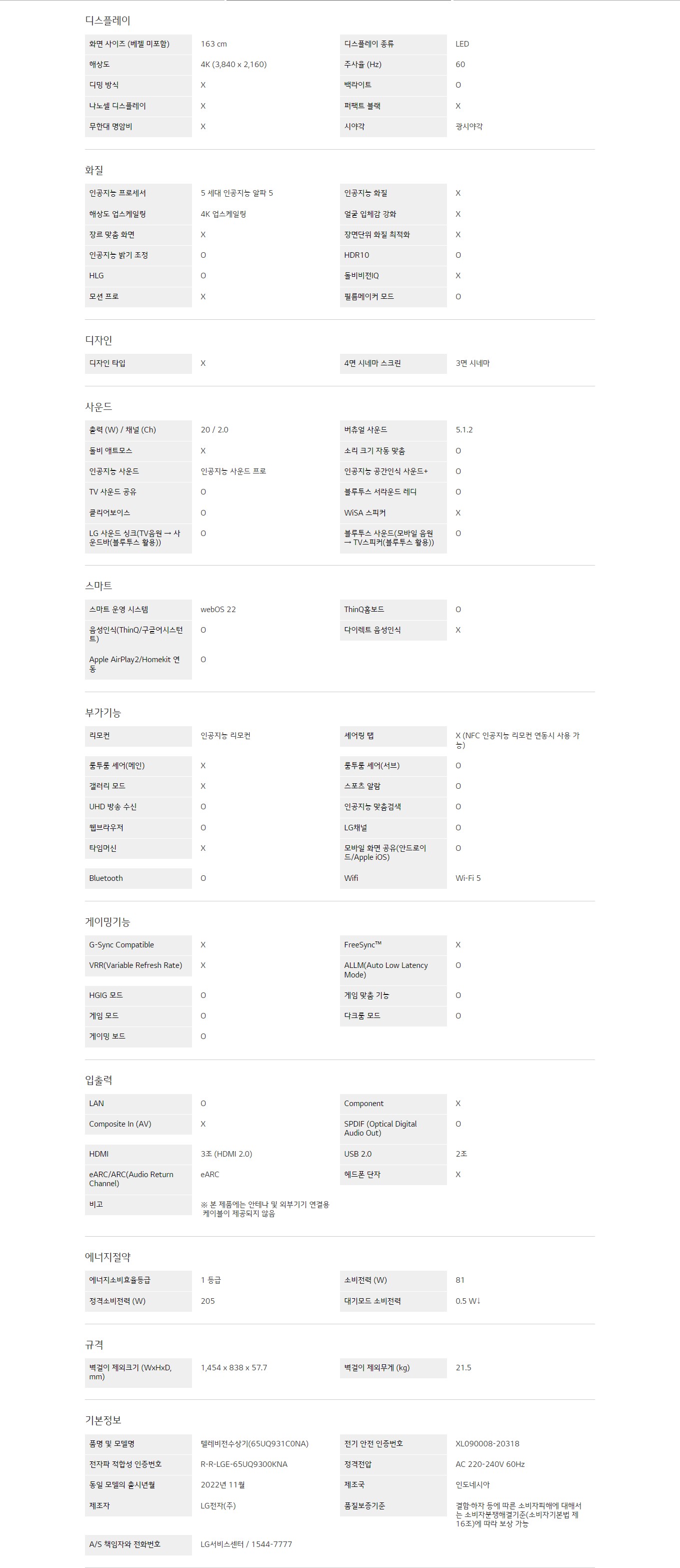 디스플레이 LG 울트라 HD TV (벽걸이형) 65UQ931C0NA