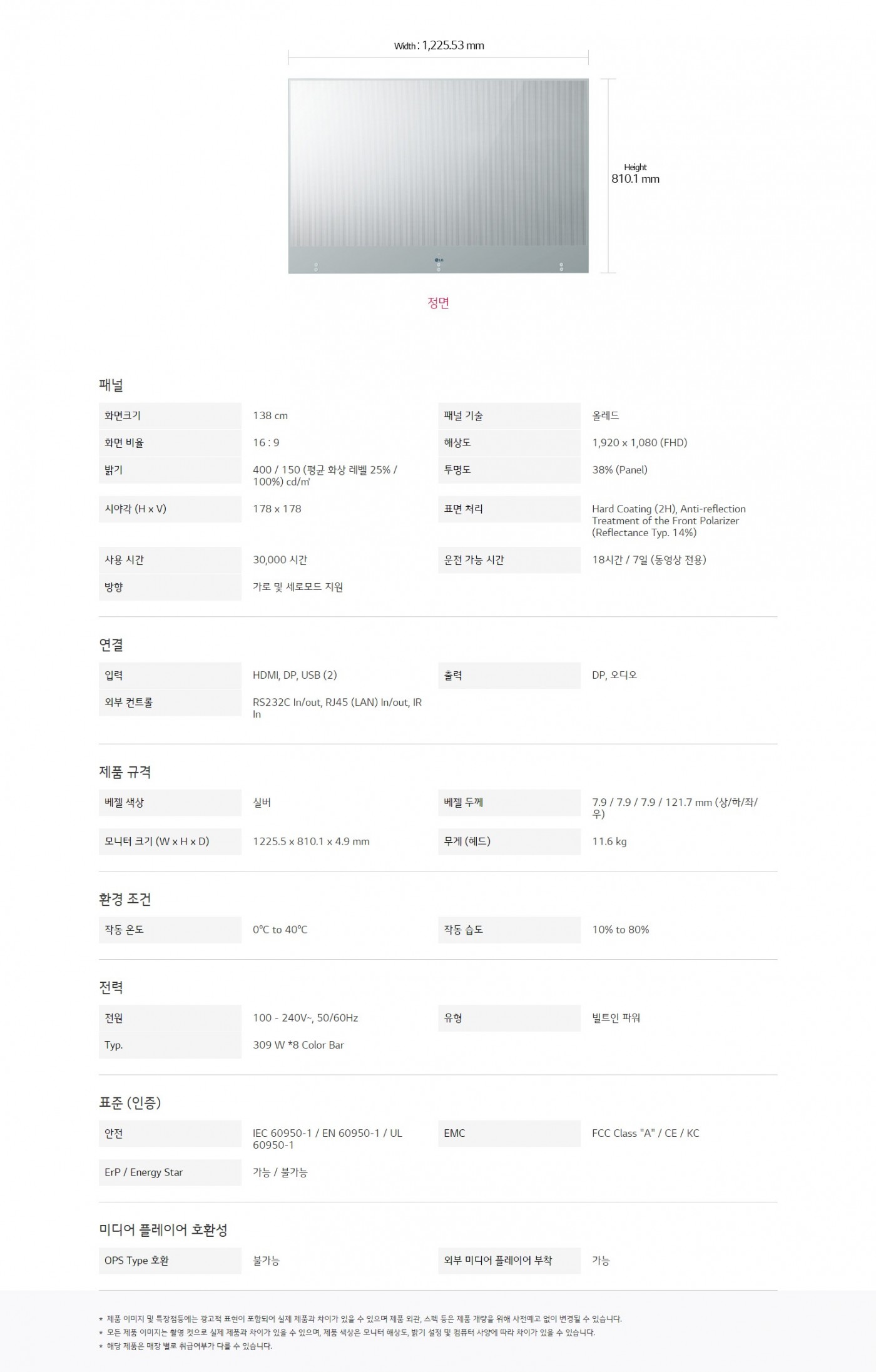 화면크기 : 138 cm밝기 : 400 / 150 (평균 화상 레벨 25% / 100%) cd/㎡